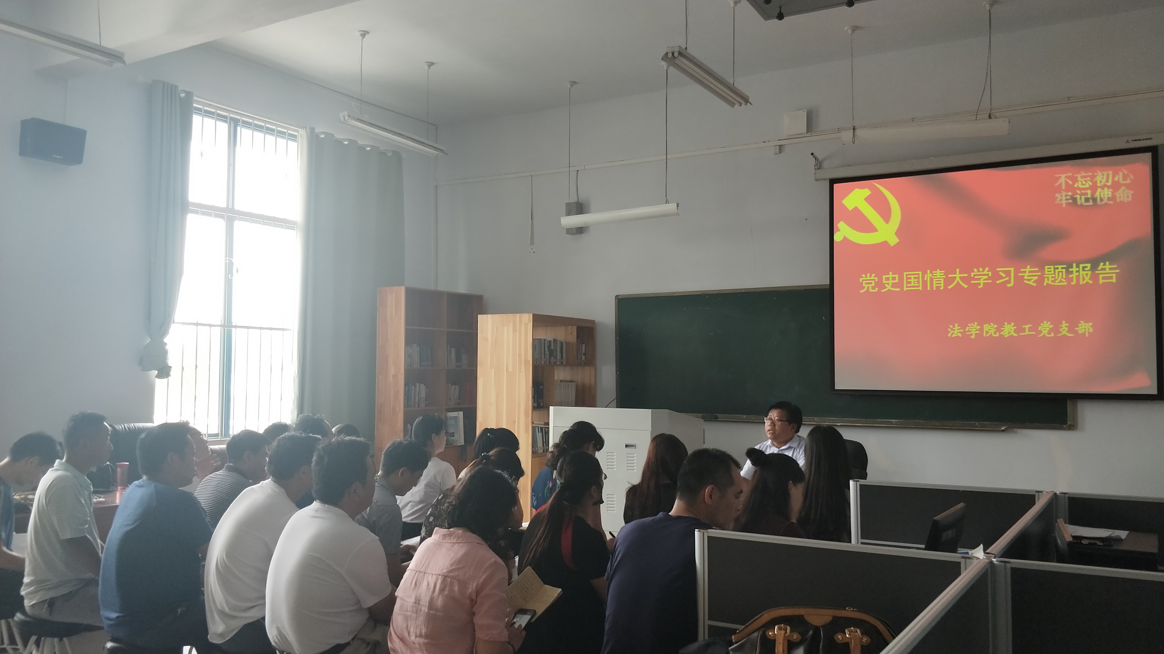 2018年7月2日,法学院教工党支部以党史国情大学习专题报告的形式开展支部党日活动。报告由法学院副院长李东坡教授主讲,李教授对习近平总书记发表的一系列关于党史和党史工作的重要讲话做出详细解读。习近平总书记关于党史和党史工作的重要论述具有很强的思想性、指导性、针对性,全体党员教师要认真学习党史,正确认识党史,充分发挥以史为鉴、资政育人的作用。而后,党员教师就党史学习的内容展开讨论,部分党员教师结合自身教学实际,分享了自己的学习心得体会。