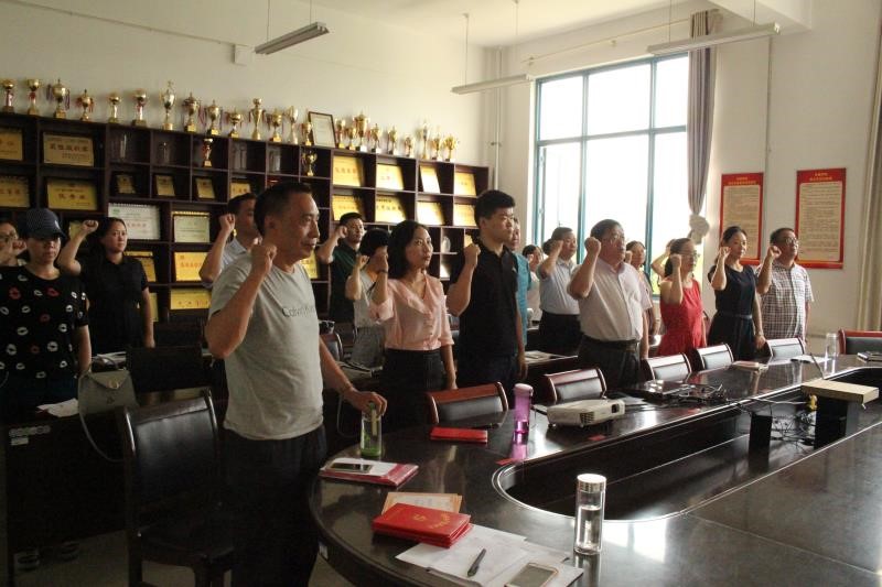 随后,与会党员收听收看了6月28日晚中央电视台《新闻联播》中的《中共中央关于追授郑德荣等7名同志称号的决定》;人民日报评论员文章《以榜样之光照亮复兴征程》;新华社长篇述评《大就要有大的样子——献给中国共产党成立97周年》。接下来,在沈振华的领誓下,全体党员面对鲜红的党旗,庄严地举起右手,重温入党誓词,誓言铿锵有力、决心不可动摇。