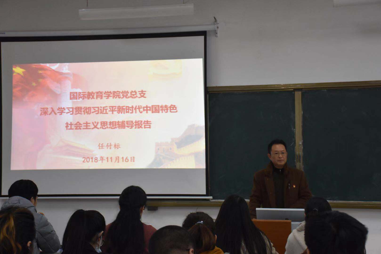 11月16日,国际教育学院院长任付标讲了主题为学习贯彻习近平新时代中国特色社会主义思想的党课,学院全体教工党员、学生党员参加了党课学习。党课由国际教育学院党总支书记李秀琴主持。